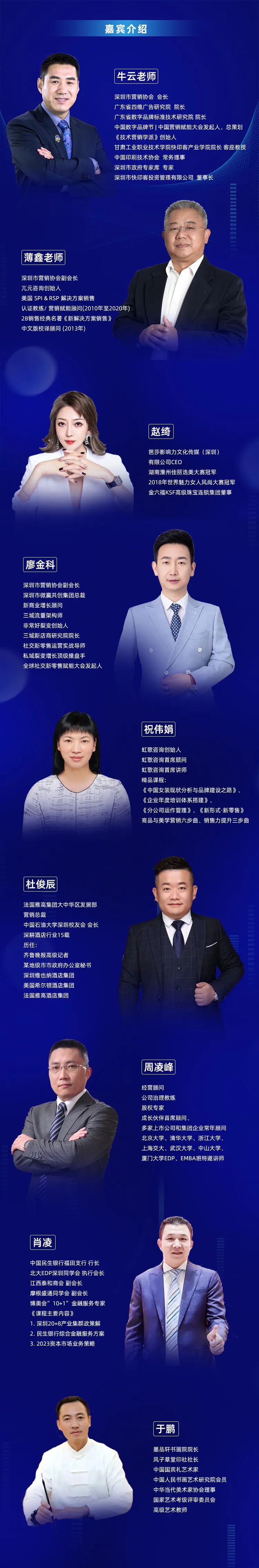 在这场活动中,我们请来了相关企业、营销专家、协会组织和银行代表,深圳市营销协会执行会长、深圳市快印客投资管理有限公司董事长牛云老师;深圳市营销协会副会长、兀元咨询创始人薄鑫老师;笆莎影响力文化传媒(深圳)有限公司CEO、金六福KSF高级珠宝连锁集团董事赵绮;深圳市营销协会副会长、深圳市微赢共创集团总裁廖金科;虹歌咨询创始人祝伟娟;法国雅高集团大中华区发展部营销总裁杜俊辰;多家上市公司和集团企业常年经营顾问、股权专家周凌峰;中国民生银行福田支行行长、北大EDP深圳同学会执行会长肖凌;墨品轩书画院院长、风子草堂印社社长、中国国宾礼艺术家于鹏……